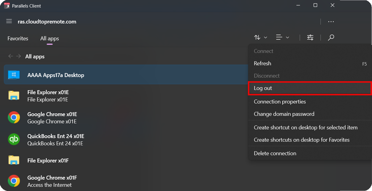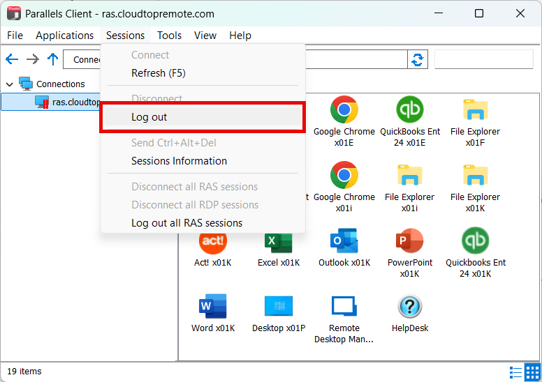 If you experience issues during your remote session, such as slowness, unresponsiveness, or a program freezing, you can log off your session without the need for support assistance. Here's how to log off using Parallels Client: