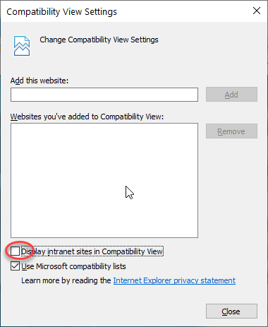 - If enabled, disable the option to Display all intranet sites in Compatibility View