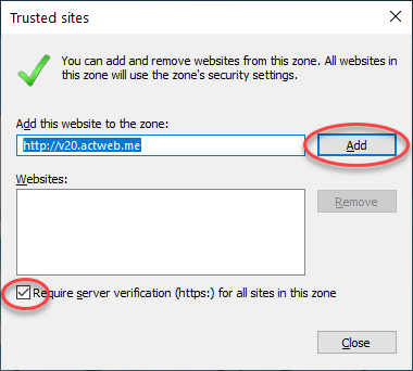 - In the Add this website to the zone: field, enter http://actweb.me/ and then click Add - Click Close on the Trusted sites